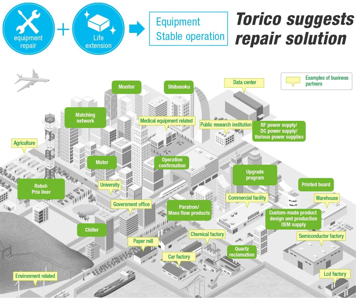 On January 1, 2000, Torico launched a repair business specializing in industrial equipment such as printed circuit boards, monitors, and RF power supplies.